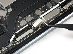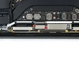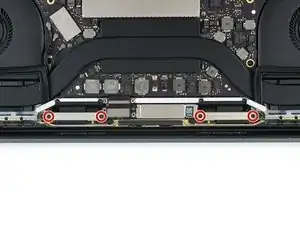 Снимите четыре винта T3 Torx длиной 1,5 мм, крепящие две алюминиевые крышки сверху двух разъёмов кабелей дисплея.