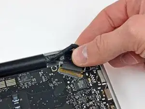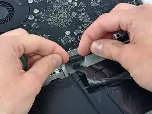 Возьмите пластиковую петлю, прикреплённую к защёлке кабеля сигнала дисплея, и поверните её в сторону разъёма питания постоянного тока.