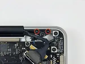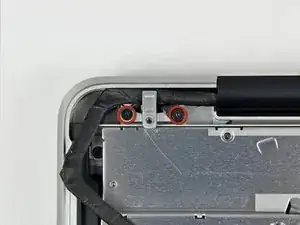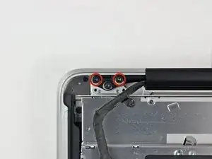Снимите внешние два винта Torx T6, фиксирующие обе петли дисплея к верхней части корпуса (всего четыре винта).