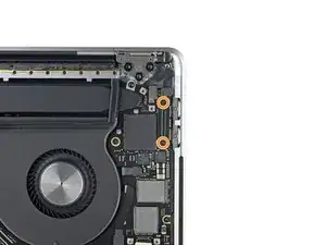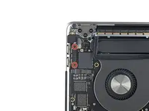 Удалите два винта 1,3 мм, крепящие крышку гибкого кабеля Thunderbolt слева.