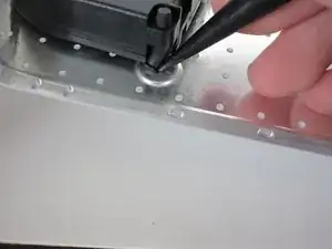Используйте пластиковую лопатку или подобный инструмент и нажмите заглушки через корпус, чтобы освободить вентилятор.