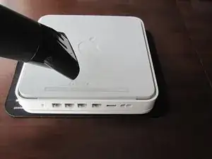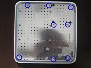 Откройте Time Capsule, обнажив винты, удерживающие корпус. Винты скрыты резиновой подкладкой, которая является нижней поверхностью устройства.