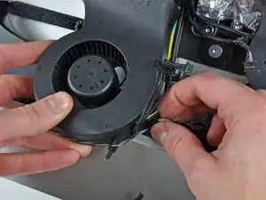 Отсоедините вентилятор процессора и кнопку питания, потянув их разъемы к левому краю iMac.