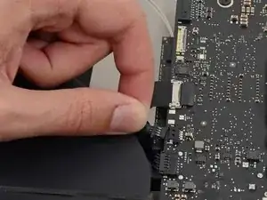 Убедитесь, что вы вытягиваете разъем кабеля данных дисплея прямо из гнезда, удерживая его параллельно плате, чтобы не повредить его.