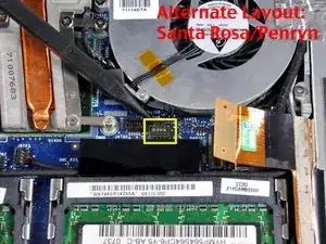 Если у вас MacBook Core 2 Duo Santa Rosa/Penryn, разъём чёрного вентилятора расположен в другом месте.