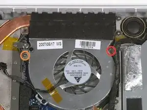 С помощью лопатки сдвиньте серые кабели данных дисплея и чёрный кабель динамика вправо. Это откроет серебристый винт, фиксирующий корпус вентилятора в нижнем корпусе.