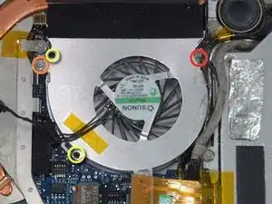 Используйте лопатку, чтобы сдвинуть вправо серый кабель дисплея и чёрные кабели динамиков. Это откроет серебристый винт, крепящий кожух вентилятора к нижней крышке.