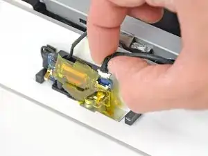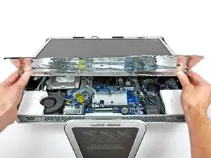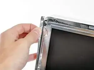 При сборке будет полезно использовать несколько небольших полосок ленты, чтобы удерживать EMI-экранирование вдоль левой и правой стороны корпуса дисплея в стороне перед опусканием дисплея в задний корпус вашего iMac.