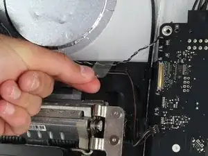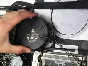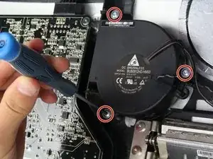 Вентилятор в этом устройстве закреплён всего несколькими винтами, но учитывайте, что при его снятии несколько проводов проходят за другими компонентами. Следите за тем, чтобы не тянуть провода слишком сильно — лучше вывести их из-за других компонентов, прежде чем полностью снимать вентилятор. Также отметьте расположение винтов и где они были установлены в устройстве, так как один винт отличается от остальных. Это значительно упростит сборку!