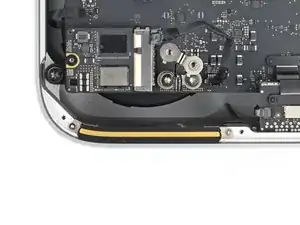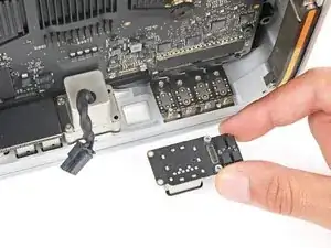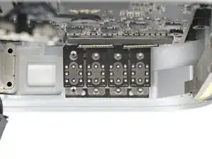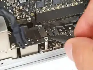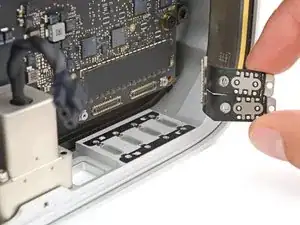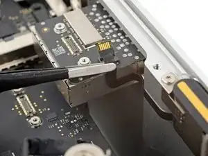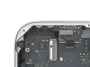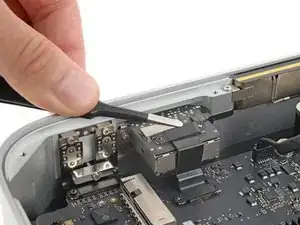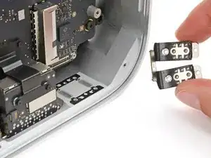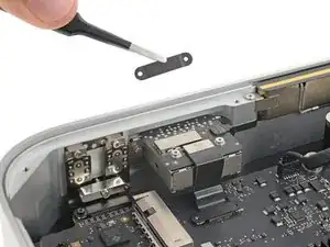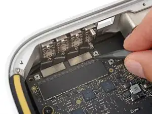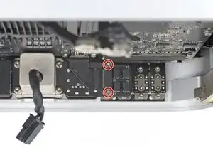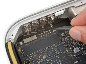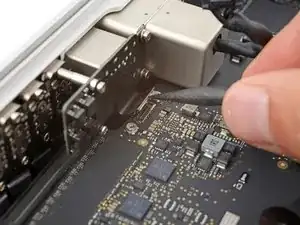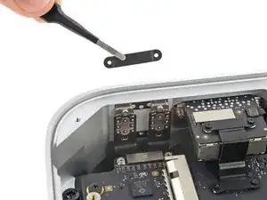 Используйте отвертку Torx T4, чтобы удалить два винта длиной 11 мм, крепящих правую сторону платы Ethernet и её крышке.