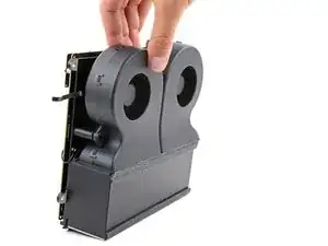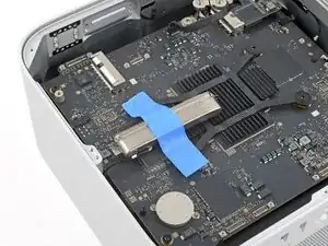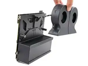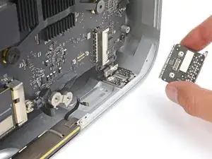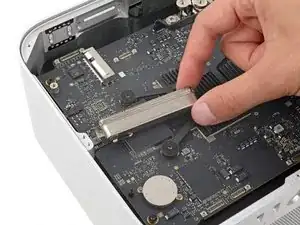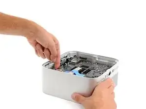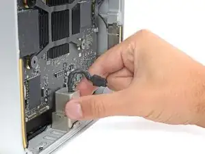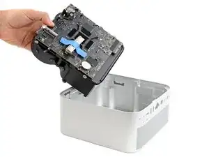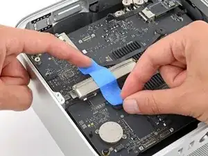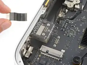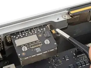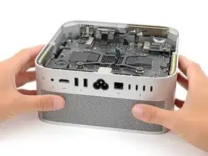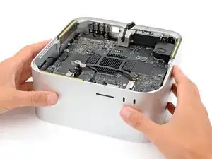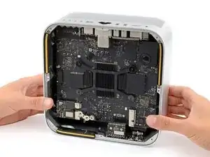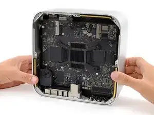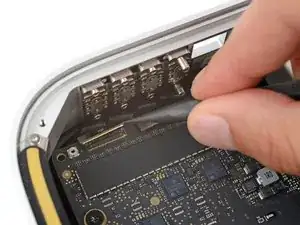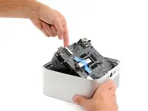 Свободной рукой осторожно приподнимите край сборки логической платы с модулями SSD, пока не сможете захватить вентиляторы. Переместите сборку к вырезу для кабеля питания, если это необходимо, чтобы помочь вам поднять её выше.