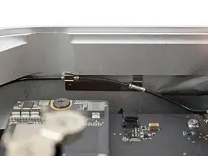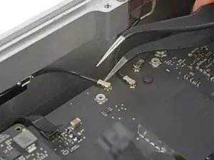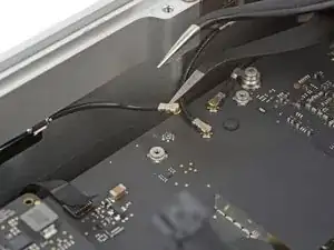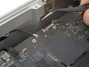 Вставьте один конец пары изогнутых пинцетов под металлическую шейку коаксиального соединителя антенны 3 (рядом с соединителем антенны 2) и поднимите его вверх, чтобы отключить.