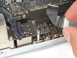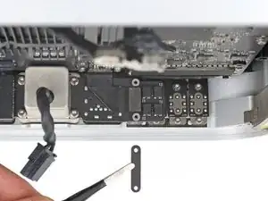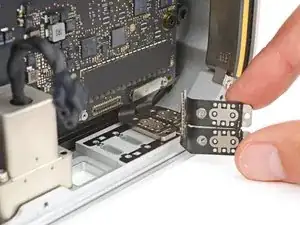 Используйте отвертку Torx T3, чтобы удалить два винта длиной 2 мм, крепящих крышку кабеля платы Ethernet.