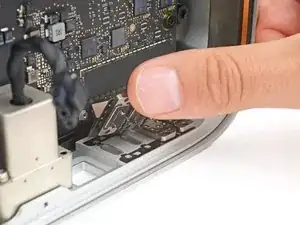 Используйте кончик лопатки или чистый ноготь, чтобы поднять запирающую крышку на ZIF-коннекторе кабеля индикатора состояния, расположенном с правой стороны картридера.