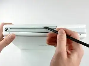 Над оптическим приводом находятся три защёлки, которые необходимо отпустить перед снятием нижнего корпуса. Вставьте лопаточку в нижний корпус над оптическим приводом и проведите её к задней части компьютера, пока не услышите три отчётливых щелчка.