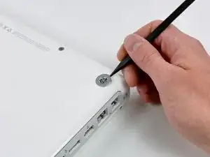 Используйте плоскую сторону плоской отвертки, чтобы снять небольшой магнит, закрывающий винт рядом с центром компьютера.
