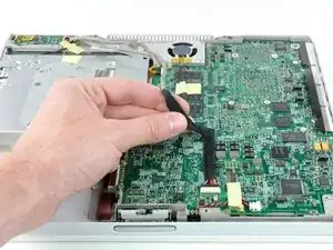 Удалите два винта Phillips, фиксирующие плату питания DC-In, при необходимости снимите ленты.