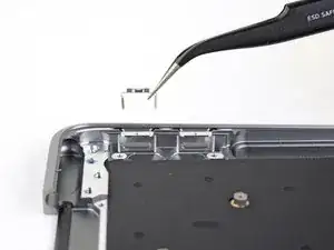 Используйте отвертку T3 Torx, чтобы выкрутить два винта 1,4 мм, фиксирующих кронштейн разъема трекпада.