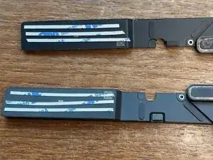 Удалите один винт T4, удерживающий каждый из динамиков. Используйте поддеватель, чтобы приподнять динамики от двустороннего скотча. При повторной установке удалите старый скотч и замените его. На третьем фото показан новый скотч, наклеенный на каждый динамик.