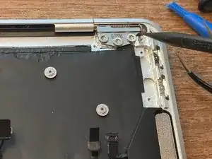 Поставьте ноутбук на бок и откройте его на примерно 90 градусов. Удалите оставшиеся винты петли. Затем вытяните петли из верхнего корпуса, чтобы отделить экран от корпуса.
