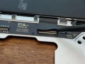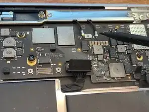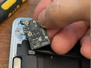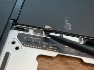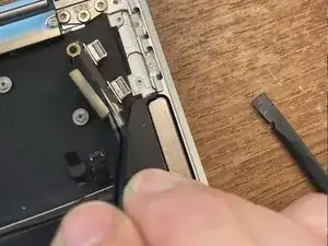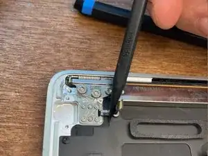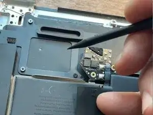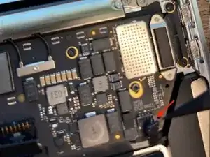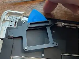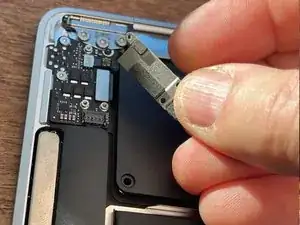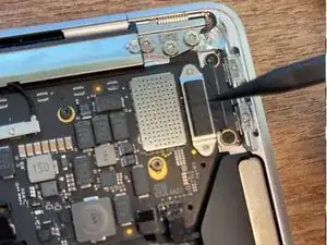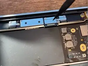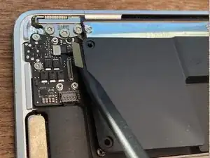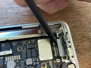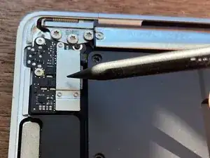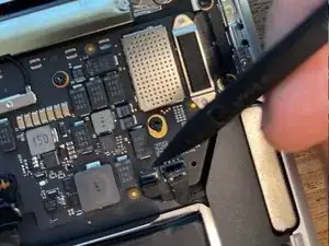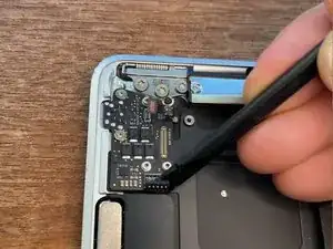 Удалите кабель соединения разъема USB-C от материнской платы. Удалите два винта T3, которые удерживают серебристый и черный кронштейн. Удалите кронштейн и используйте плоский конец лопатки, чтобы поднять разъем с платы.