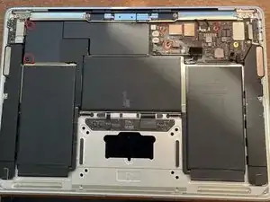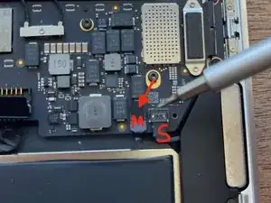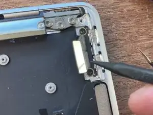 Удалите шесть винтов T4, чтобы снять разъем биометрической кнопки питания. Откройте ноутбук, чтобы кнопка TouchID выпала, протянув ее кабель через прорезь в верхней части корпуса.