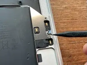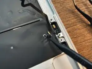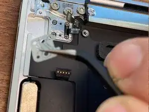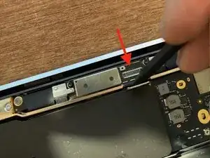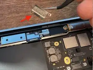 Удалите один винт T3 и поднимите крепление разъема Wi-Fi серебристого цвета. С помощью безопасных для ESD пинцетов поднимите два кабеля из их разъемов на материнской плате, держась за основание разъемов.