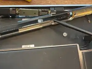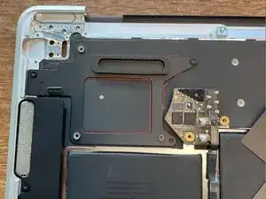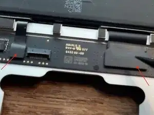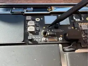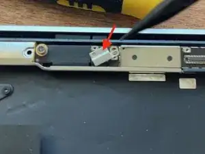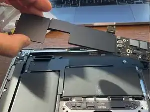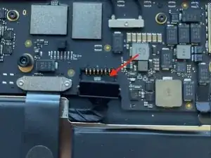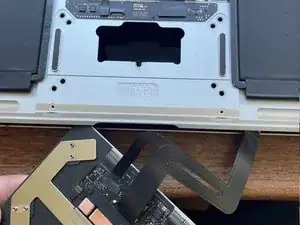 Отключите кабель тачпада от материнской платы и дочерней платы. Два винта T3 удерживают кронштейн и соединение с материнской платой. На дочерней плате поднимите фиксирующую защелку и потяните кабель к батарее, держась за черную изоляцию, чтобы отключить его от платы.