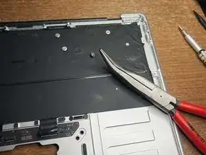Удалите четыре винта. Они не Pentalobe и не T4. Я использовал плоскогубцы, чтобы ухватить их, чтобы ослабить, а затем использовал пинцет для удаления.