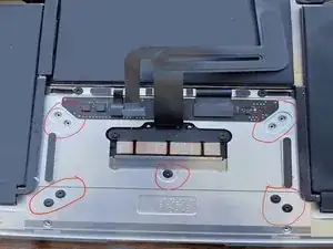 Удалите 9 черных винтов T5, которые удерживают тачпад в нижней части корпуса. 8 черных винтов находятся по углам и один посередине. Затем откройте ноутбук, чтобы взять тачпад в руку и пропустить кабель тачпада через отверстие в нижней части корпуса.