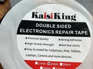 Для повторной установки используйте пинцет, чтобы удалить старый двусторонний скотч и заменить его полосками между отверстиями для винтов с каждой стороны. Красная линия на фотографии показывает, где разместить новый двусторонний скотч во время сборки.