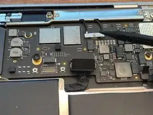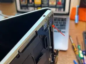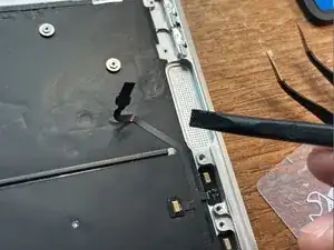 Мой новый верхний корпус — сделанный Apple и купленный у iFixit — не имел дочерней платы, поэтому мне пришлось ослабить скотч, который её удерживал, и аккуратно приподнять её.