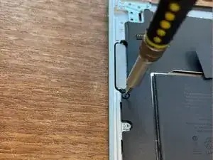 Используйте пинцет, чтобы вытащить три кусочка двустороннего скотча между батареей и верхним корпусом слева и справа.