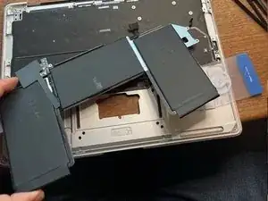 Один кусочек скотча порвался, прежде чем я смог его убрать, поэтому я поддевал под батарею карточкой, чтобы отделить батарею от скотча. Поднимите, чтобы удалить батарею из верхнего корпуса.