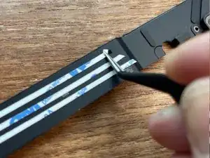 Поднимите фиксирующие крепежи на двух соединителях и используйте пинцет, чтобы ухватить черный скотч и вытащить каждый из двух кабелей из их соединителей на плате-сестре.