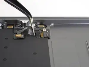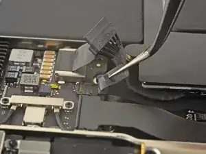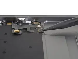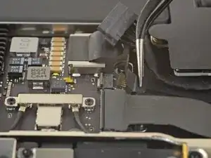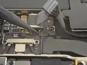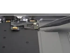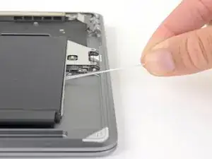 Используйте плоский конец лопатки, чтобы поддеть разъём кабеля трекпада и вытащить его из гнезда.