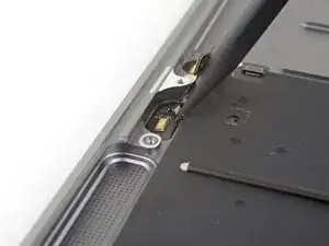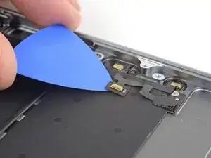 Просуньте наконечник лопатки под кабель левого динамика и подденьте прямо вверх, чтобы отключить динамик.
