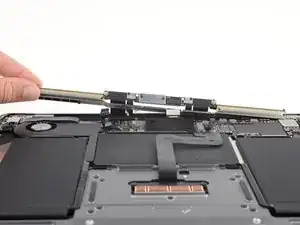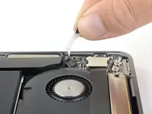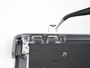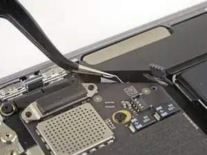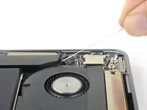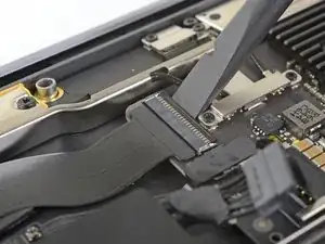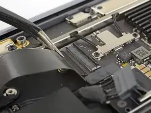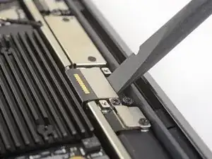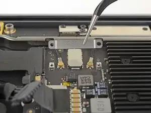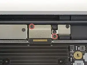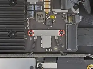 Используйте отвертку Torx T3, чтобы снять два винта 1,5 мм, фиксирующие кронштейн разъёма кабеля дисплея.