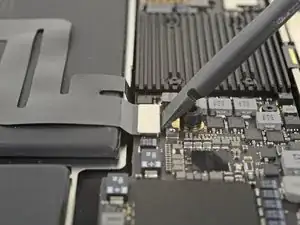 Используйте плоский конец лопатки, чтобы поддеть разъём кабеля USB-C и вытащить его из гнезда на плате.