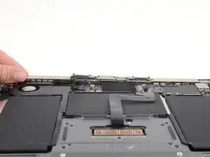 Осторожно подденьте лезвием для вскрытия кабель трекпада в направлении разъёма клавиатуры, чтобы отделить клей, приклеивающий его к верхней крышке.