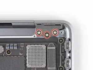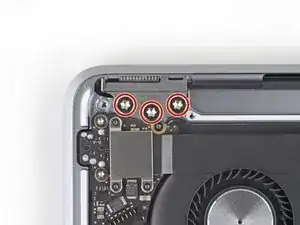 Используйте отвертку Torx T3, чтобы снять три винта 1,4 мм, фиксирующие кронштейн кабеля аудиоплаты.