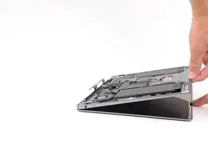 Не переворачивая ноутбук (он всё ещё лежит дисплеем вниз), аккуратно откройте его. Трекпад останется лежать на дисплее.