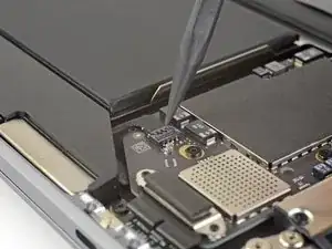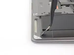 Используйте пинцет, чтобы приподнять чёрную клеевую петлю на боковой стороне аккумулятора настолько, чтобы её можно было захватить пальцами.