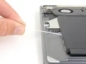 Просуньте пластиковую лезвие под оставшуюся часть кабеля микрофона, чтобы отделить её от клея, прикрепляющего кабель к верхней крышке.