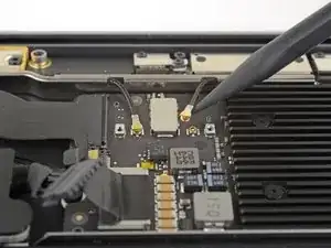 Используйте отвертку Torx T3, чтобы снять два винта 1,4 мм, фиксирующие кронштейн кабеля антенны.
