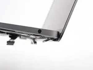 Используйте пинцет, чтобы приподнять клейкую оттяжку в верхней части левого динамика настолько, чтобы Вы могли захватить её пальцами.