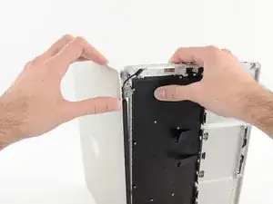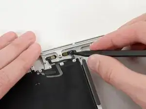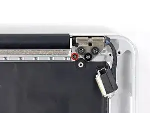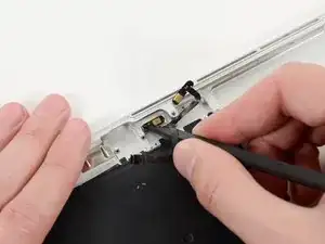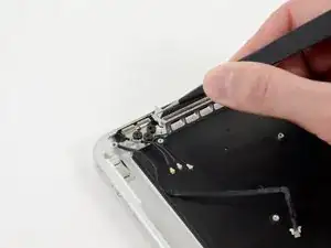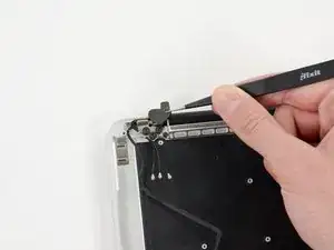 С помощью пинцета снимите алюминиевые кронштейны петель с правой и левой петель дисплея.