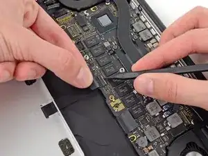 Используйте пинцет, чтобы снять маленькую пластиковую крышку, расположенную в правом нижнем углу платы разъема аккумулятора.