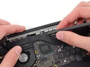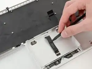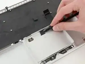 Проведите лопаткой по нижней части, чтобы освободить кабель ленты трекпада от клея, фиксирующего его к верхней части корпуса.