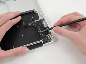 Используйте плоский конец лопатки, чтобы поддеть разъем кабеля разъёма наушников и вынуть его прямо вверх из гнезда на логической плате.